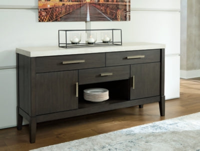 • Create your ideal dining area with the Westonfort server. Its dark espresso brown finish and clean lines are undeniably contemporary, but the attitude is more relaxed—our interpretation of metropolitan casual design. Cabinets, shelves and spacious drawers conveniently store dining accessories. It also effortlessly works as a sideboard, entryway table or TV stand. Wherever you place it, this perfectly stylish server is the versatile piece you've been looking for.